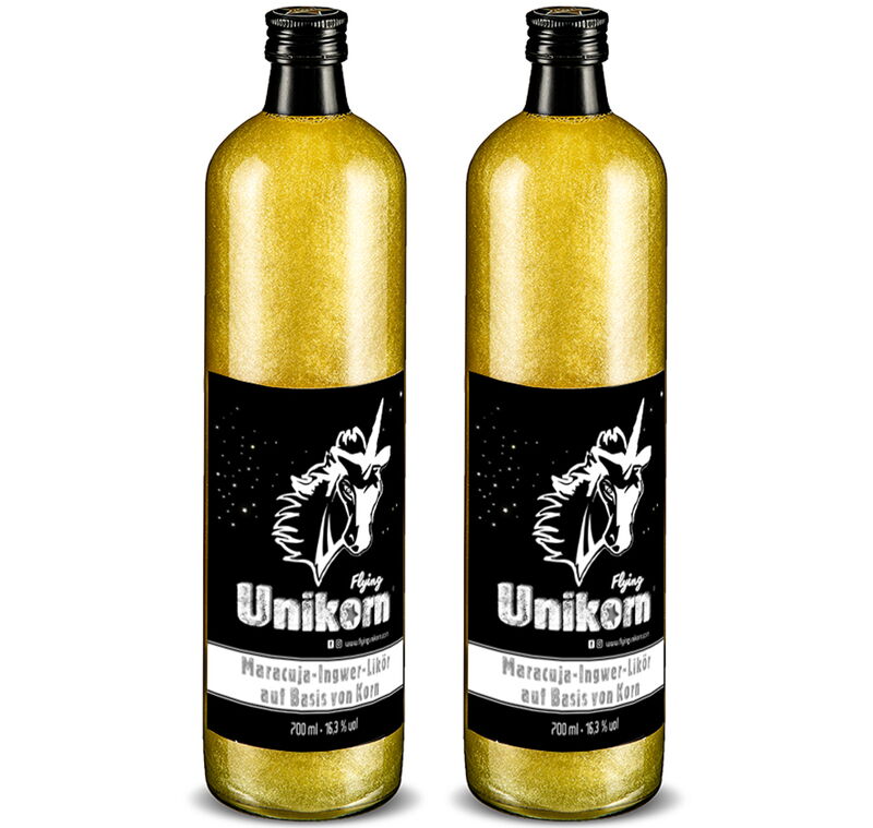 2 x Fruchtlikör aus Traditionskorn mit der fruchtigen Frische von Passionsfrucht und der leichten, angenehm mild prickelnden Schärfe von Ingwer. Glitzert im Licht. Eisgekühlt genießen: Schmeckt super pur als Shot oder gemixt mit Tonic oder Sekt/ Prosecco auf Eis als Cocktail Glitzer Sprizz. Erfunden in Köln, meisterlich gebrannt am Niederrhein. Schüttel dein Horn! Dann glitzert der Korn.